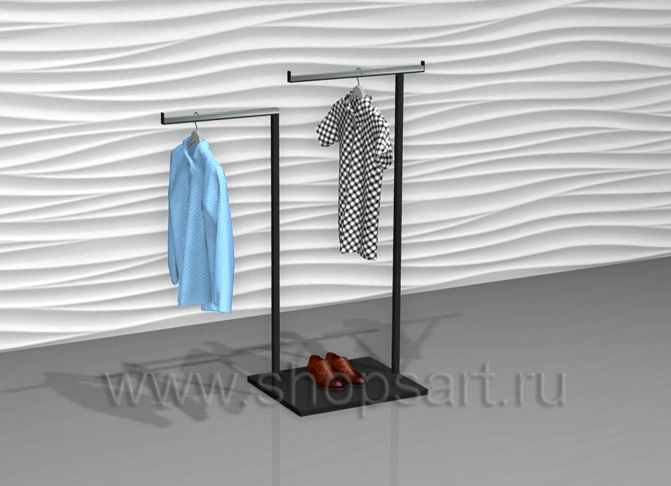 Островная, двухсторонняя Г-образная стойка используется для вывески одежды и выкладки на подиум сопутствующих товаров, отлично подойдет для презентации сезонных коллекций, новых моделей одежды. Эта оригинальная стойка, эксклюзивной формы разработана, для хорошего обзора товара и удобного доступа к нему покупателям. Торговая стойка имеет в своей основе металлическую сварную квадратную трубу 25х25мм. с покрытием порошковой краской чёрного, матового цвета.Подробнее