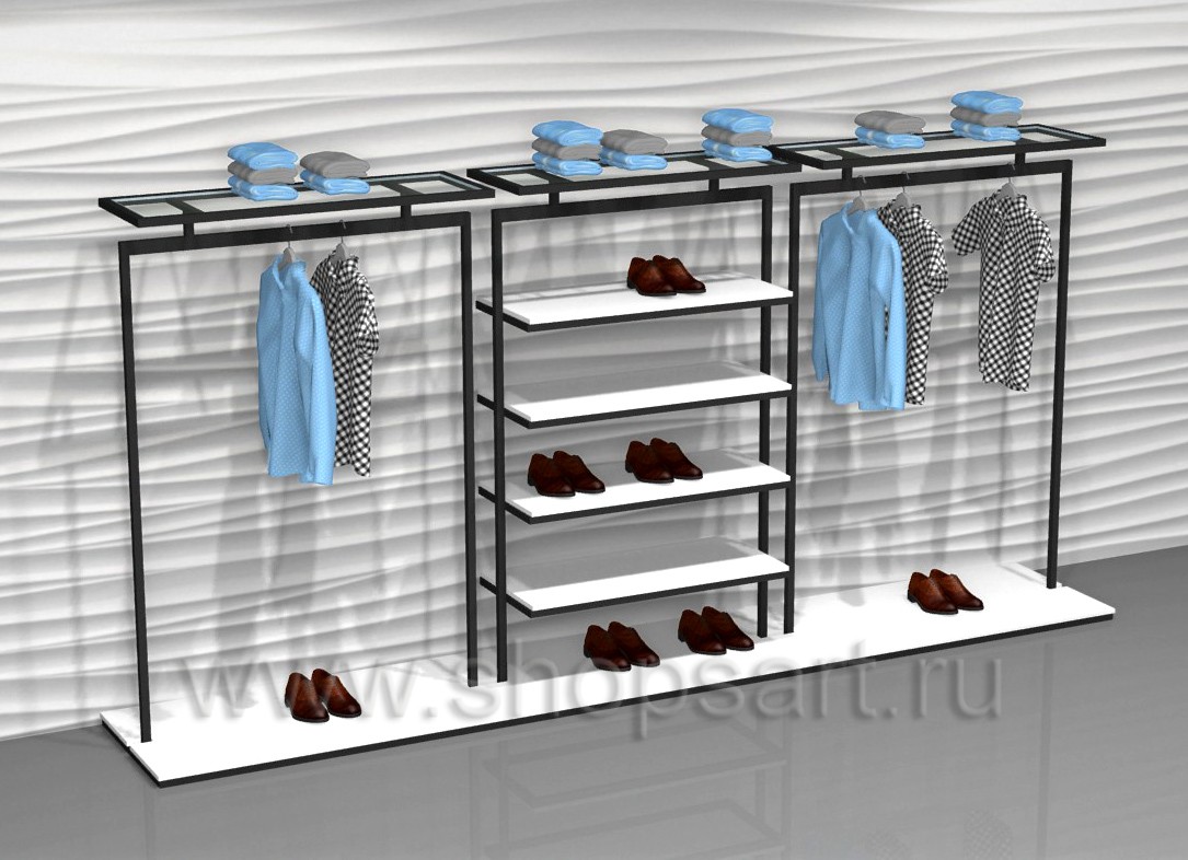 Представленное торговое оборудование для магазинов одежды является сборным модулем, состоящим из трёх элементов для выкладки и навески товара. Этот универсальный пристенный стеллаж является готовой композицией, с помощью которой можно демонстрировать коллекцию, состоящую из разных групп товаров. Используется для вывешивания одежды, выкладки трикотажа, сумок, аксессуаров. Нижний подиум используется для выкладки обуви и сумок. Торговый стеллаж имеет в своей основе металлическую сварную квадратную трубу 25х25мм. с покрытием порошковой краской чёрного, матового цвета.Подробнее