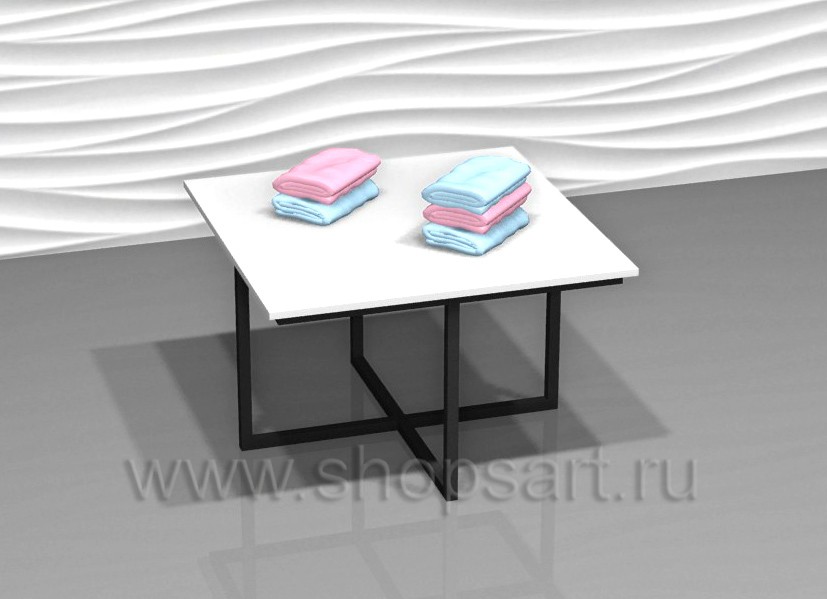 Стол демонстрационный, квадратный используется для выкладки товара. Столик небольшой высоты с открытой поверхностью, удобен для демонстрации одежды, обуви, аксессуаров. Островная конструкция может использоваться для презентации новых коллекций. Размещается в торговом зале, но может быть и элементом интерьера и устанавливаться рядом с диваном в зоне ожидания. Демонстрационный столик для магазинов имеет в своей основе металлическую сварную квадратную трубу 25х25мм. с покрытием порошковой краской чёрного, матового цвета.Подробнее