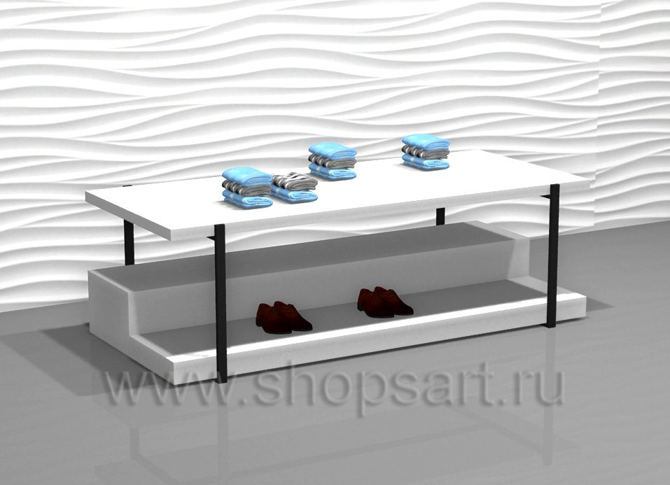 Стол демонстрационный с подиумом и столешницей используется для выкладки товара. Островная группа предназначена для выкладки различного товара: трикотаж, джинсы, аксессуары, в нижней части стола устанавливается подиум для демонстрации обуви. Демонстрационный стол для магазинов имеет в своей основе металлическую сварную квадратную трубу 25х25мм. с покрытием порошковой краской чёрного, матового цвета.Подробнее