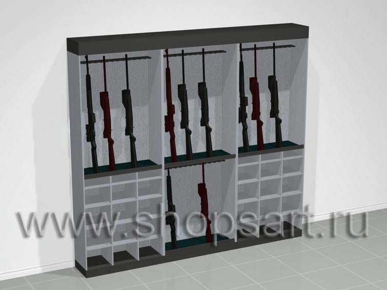 Шкафы для ружей и аксессуаров, с ячейками для выкладки товара. Благодаря конструктивной возможности расположения товара в нижнем ряду, блок стеллажей обеспечивает большую вместимость моделей оружия. Ячейки можно использовать как накопители для патронов, предметов ухода за оружием, сопутствующих товаров. Оружейные шкафы изготавливаются из ЛДСП. Размеры блока шкафов и его конфигурация могут меняться в зависимости от пожеланий Заказчика.