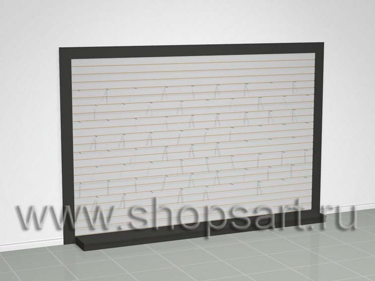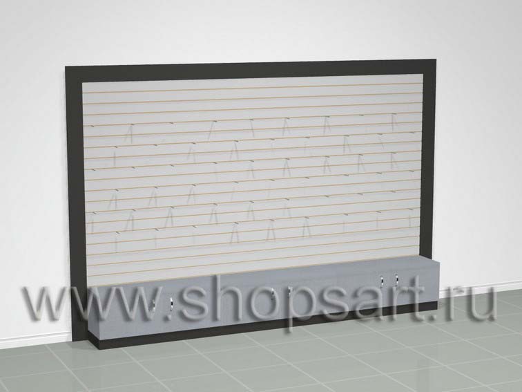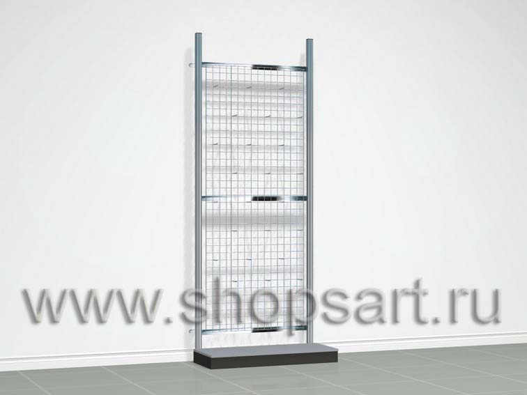 Стеллаж изготавливается из хромированных стоек на опорах. Стенка — решетка с крючками для навески мелкого товара. Часто применяется для демонстрации крючков, приманок, и др. как в торговом зале, так и на выездных выставках. В нижней части устанавливается подиум для крупногабаритных товаров.