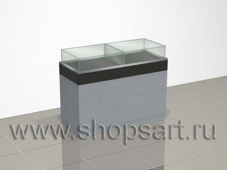 Прилавок торговый выполнен из ЛДСП двух цветов. В нижней части прилавка имеется накопитель для товара или упаковки. Верхняя часть, предназначенная для выкладки товара, изготовлена в виде стеклянных колпаков, имеющих выдвижную каретку с замком. Прилавки могут стоять возле стен и в центре зала. Используются для продажи пистолетов, патронов и ножей. В подобные прилавки можно выкладывать катушки для спиннингов и приманки.
