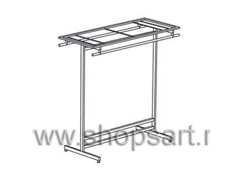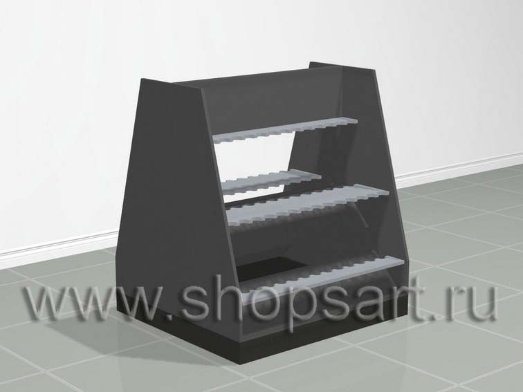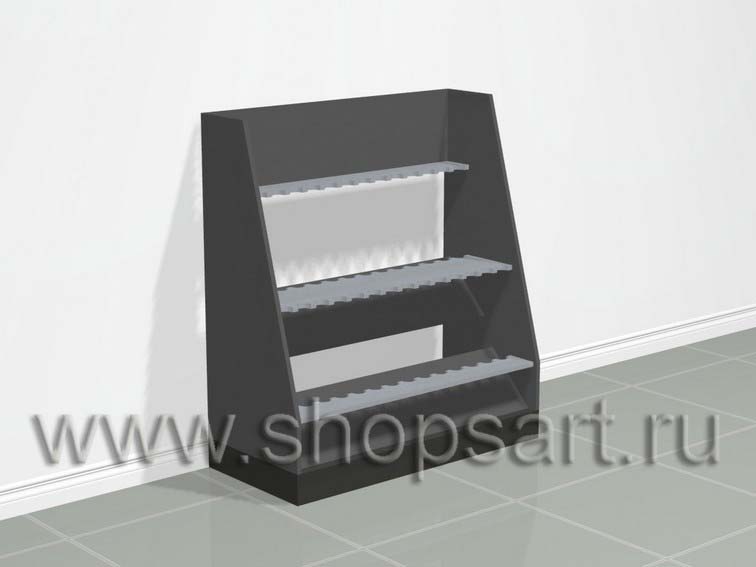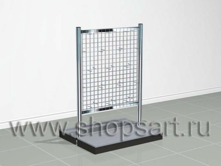 Стеллаж изготавливается из хромированных стоек на опорах. Задняя стенка — решетка с крючками, для навески мелкого товара. Часто применяется для демонстрации крючков, приманок, и др. как в торговом зале, так и на выездных выставках. В нижней части устанавливается подиум для крупногабаритных товаров.