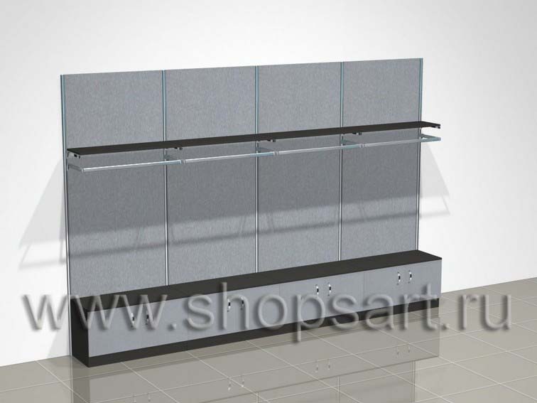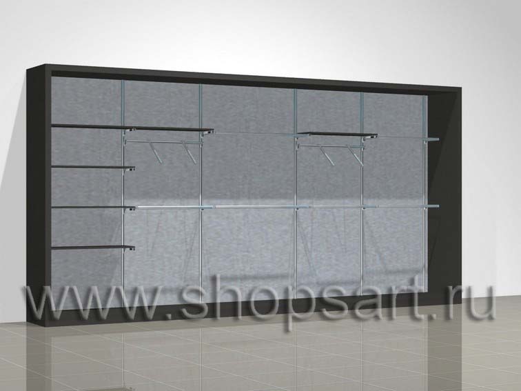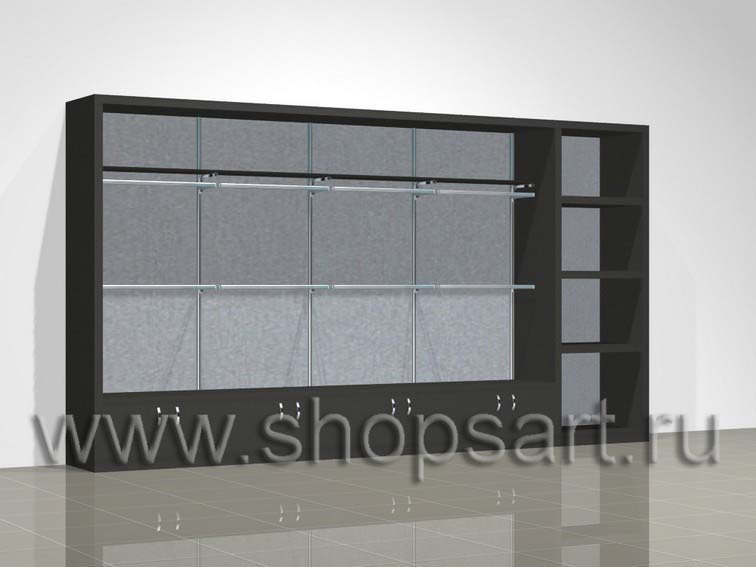 Блок стеллажей, оформленный в виде ниши, предназначен для демонстрации одежды для охоты и рыбалки. Стеллаж открытый, для камуфляжа и спортивной одежды изготавливается из ЛДСП. В нижней части стеллажей устанавливаются подиумы для крупногабаритного товара. Стеллажи разработаны на основе перфорированных стоек с креплением к стене. Возможна установка стоек на опорах, не требующих крепления к стене. На стойки устанавливаются кронштейны для развешивания одежды. Полки и кронштейны регулируются на различную высоту. Стеллажи для одежды имеют боковые и верхние стенки. В верхней части стеллажа возможна установка светильников для подсветки товара. Сбоку может располагаться стеллаж для обуви или сумок с полками.
