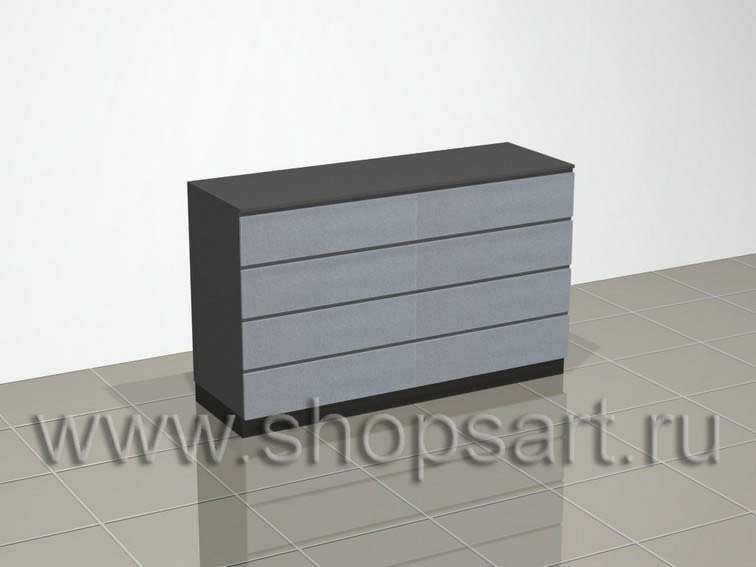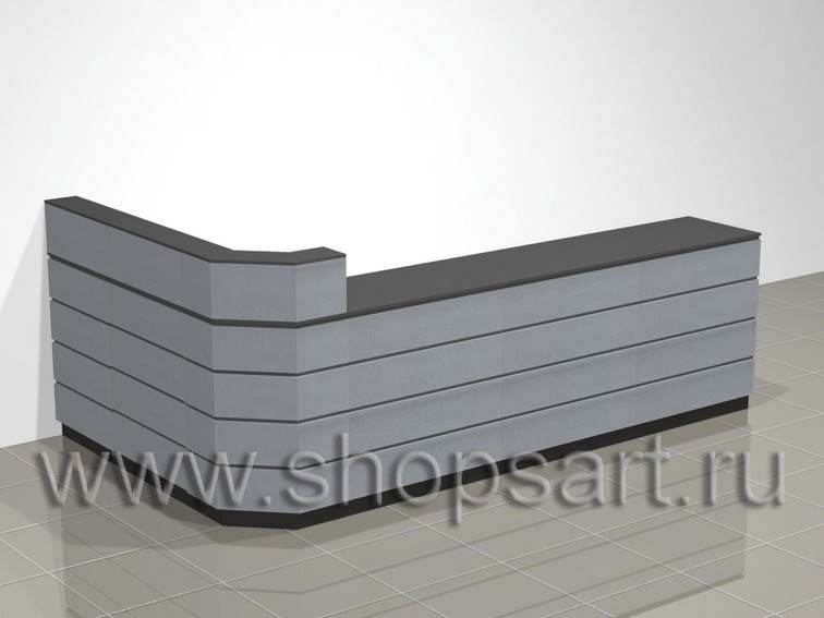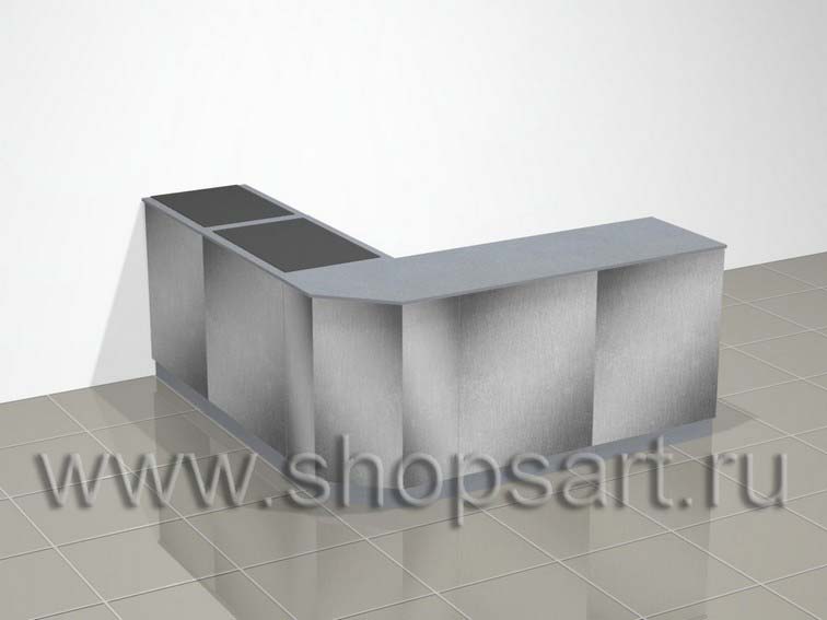 . Стол кассовый совмещен с зоной демонстрации, упаковки оружия и показа других товаров и аксессуаров. Изготавливается из ЛДСП, часть столешницы имеет накладки из оргалита обтянутого сукном. Накладки используются для демонстрации оружия. Кассовый стол имеет наполнение выдвижными ящиками и отделами с распашными дверками. В кассе предусмотрены ниши и отверстия с заглушками для проводов и снятия защиты. По видимой, внешней, части касса облицована металлизированным пластиком. Наполнение кассового стола может быть исполнено любое, по желанию Заказчика.