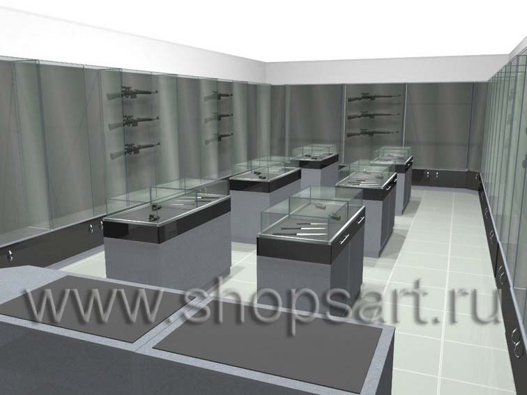 Оборудование для оружия имеет брутальный вид и хорошо подходит для продажи на данном оборудовании товаров для охоты. В шкафах для демонстрации оружия задние стенки обтягиваются серым сукном. Широкий ассортимент торгового оборудования позволяет наглядно демонстрировать гладкоствольное оружие, размещая его по периметру магазина в высоких закрывающихся на замки витринах. В оружейных витринах предусмотрено крепление в виде оружейных замков, на которые устанавливается сигнализация. Для пистолетов и патронов предусмотрены варианты островных прилавков, которые так же можно выставить в ряды для заприлавочной торговли.