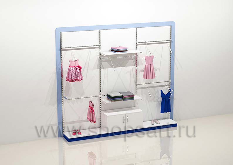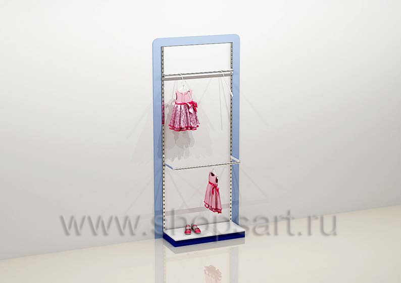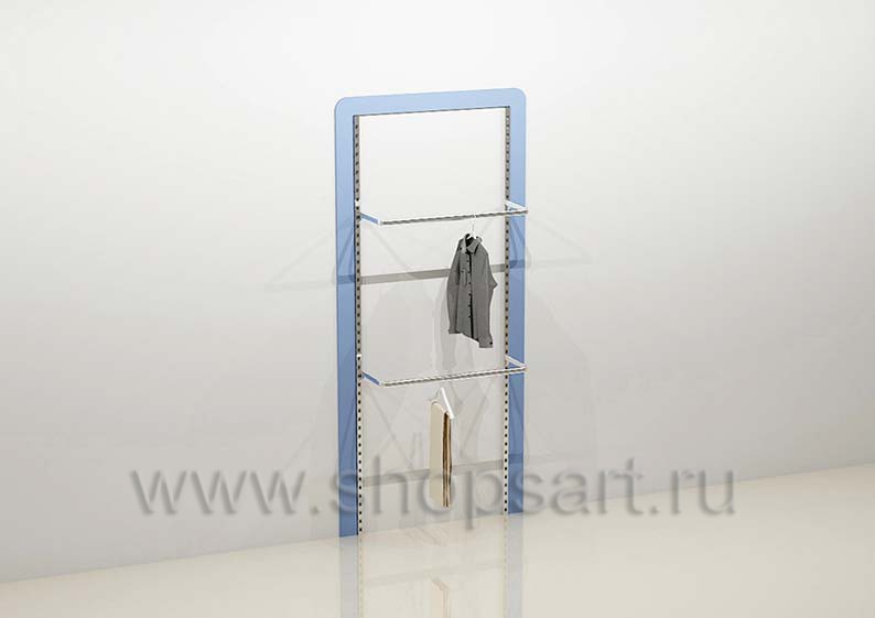 Стеллаж торговый для одежды имеет открытую конструкцию, оснащен навесными фронтальными и наклонными кронштейнами для демонстрации одежды, регулируемыми по высоте. Стеллаж обрамляется декоративной, радиусной рамкой, выполненной из матового, голубого цвета ЛДСП 16 мм. Перфорированные стойки и декоративная рамочка крепятся к стене, а навесные элементы устанавливаются в перфорированную стойку.