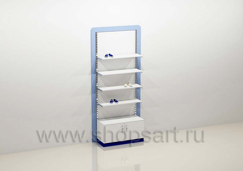 Стеллаж торговый пристенный предназначен для демонстрации обуви, сумок или любых других товаров. Полочки для демонстрации товара выполнены из белого, матового ЛДСП 16 мм. В нижней части устанавливается накопитель с распашными дверками для хранения товара. Стеллаж оформлен в декоративную радиусную рамку, выполненную из ЛДСП голубого, матового цвета. Рамка и перфорированные стойки крепятся к стене, полкодержатели регулируются по высоте.