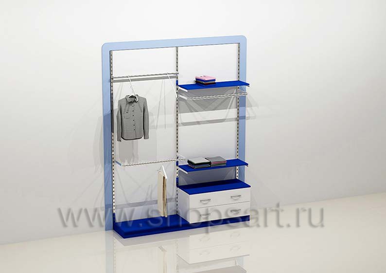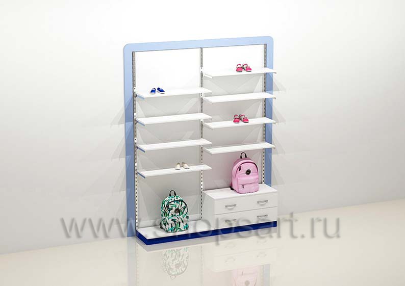 Торговый стеллаж для демонстрации товара с навесными кронштейнами, имеет открытую конструкцию состоящих из двух торговых секций. Для выкладки товара устанавливаются полочки, выполненные из матового ЛДСП 16 мм синего цвета. В нижней части секции блока стеллажей устанавливается накопитель для хранения размерного ряда товара с выдвижными ящиками или распашными дверками. Все навесные элементы устанавливаются в перфорированную стойку и регулируются по высоте.