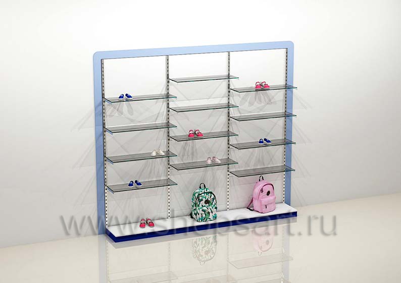 Пристенный стеллаж для товара, имеет две открытые секции со стеклянными полочками, предназначенными для демонстрации обуви, сумок или любых других товаров. Обувь размещается на стеклянных полках, установленных по высоте на разном уровне, что позволяет красиво оформить выкладку товара. Комплектуется полкодержателями, регулируемыми по высоте. В нижней части стеллажей устанавливаются подиумы, выполненные из белого, матового ЛДСП с синим цоколем. Стеллажи обрамлены в декоративную рамку голубого, матового цвета.