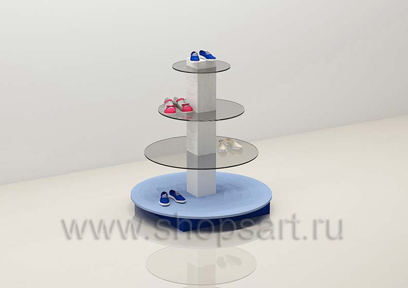 Стойка торговая, островная представлена в виде многоуровневой конструкции с круглыми полочками разного диаметра, служит для выкладки товара или обуви. Предназначена для оформления островных конструкций в центре торгового зала детских магазинов обуви, одежды или аксессуаров. Торговая островная стойка выполнена из белого, синего и голубого матового ЛДСП. Полочки для выкладки товара выполнены из стекла 8 мм.