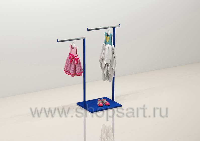 Стойка островная Г-образная используется для демонстрации одежды в торговом зале. В нижней части островной стойки имеется подиум для выкладки обуви или сумок. Эта эксклюзивная островная стойка необычной формы привлечет покупателей к эксклюзивной одежде или новинкам размещенным на ней. Используется в торговом зале или выставочном павильоне. Торговая стойка имеет в своей основе металлическую квадратную трубу 25×25 мм, с покрытием порошковой краской, цвет «Ультрамарин» по карте RAL5002 или любой другой цвет по желанию заказчика.
