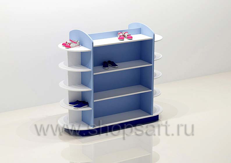 Торговый остров для выкладки товара, имеет открытую конструкцию с полочками с четырех сторон, удобен для выкладки и демонстрации обуви. Предназначен для оформления торгового пространства в центральной части детского магазина, позволит красиво и презентабельно представить товар. При изготовлении торговой стойки использовался материал ЛДСП 16 мм матового, голубого и белого цветов. Вся конструкция устанавливается на низкий демонстрационный подиум, выполненный из синего, матового ЛДСП 16 мм.