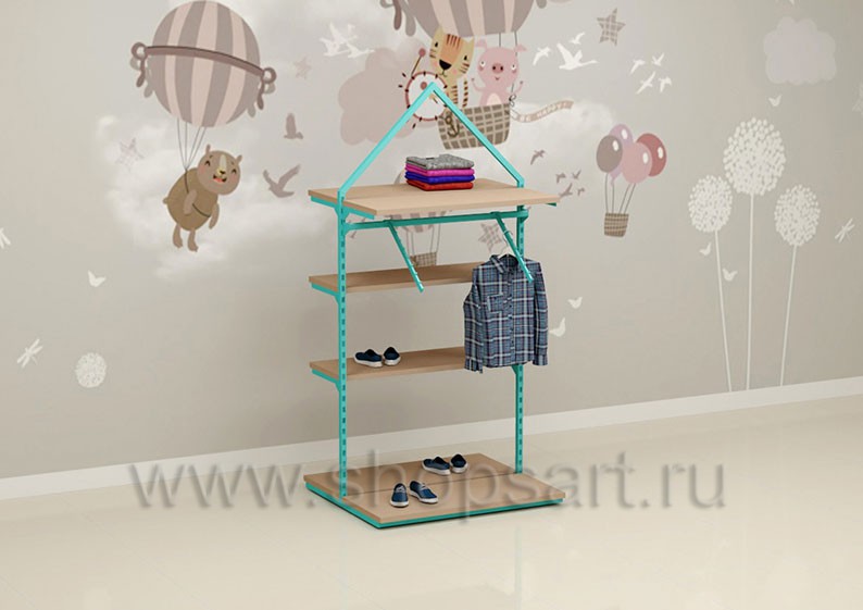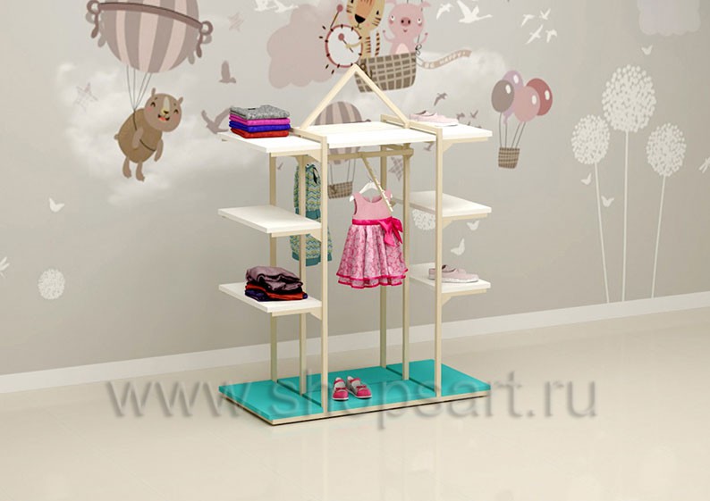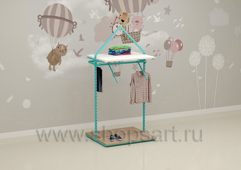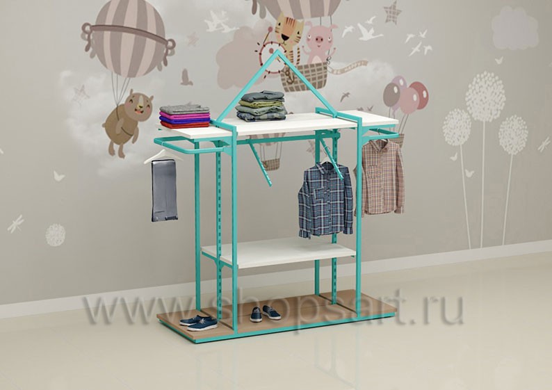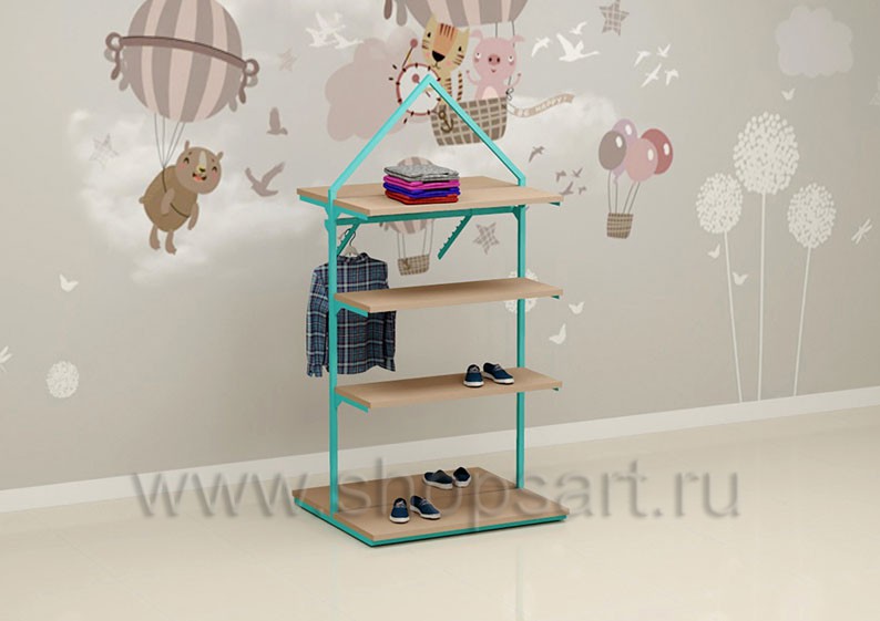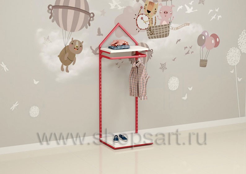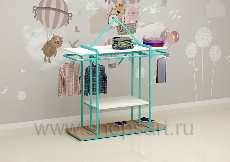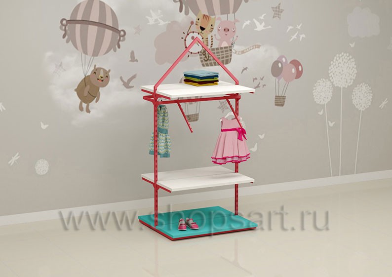 Торговый стеллаж предназначен для демонстрации детской одежды, имеет навеску из «П» образного кронштейна и верхней полочки для выкладки одежды из трикотажа или головных уборов. В нижней части стеллажа устанавливается полочка, на которой можно представить обувь или сумки. Конструкция торгового стеллажа оформлена в виде домика, выполнена из металлической, квадратной трубы с перфорацией.