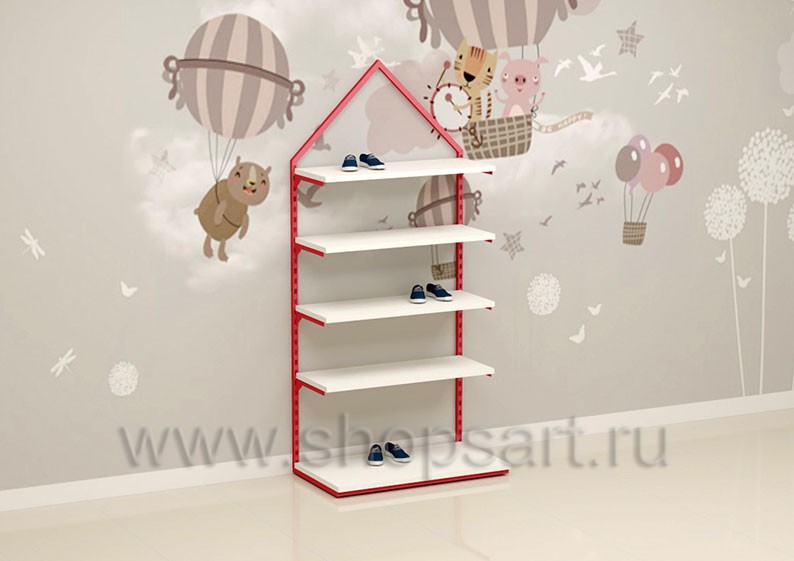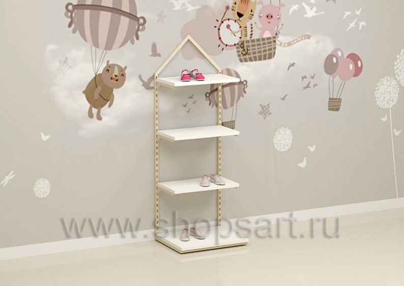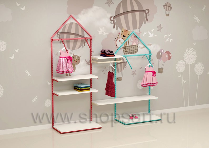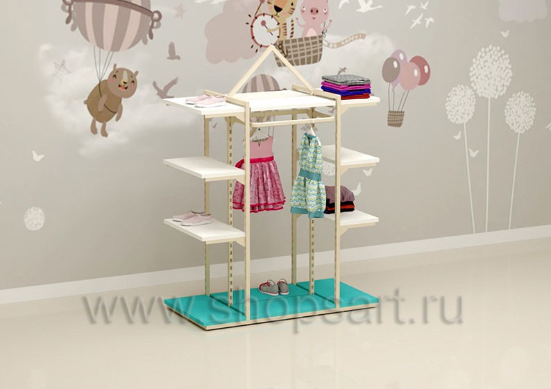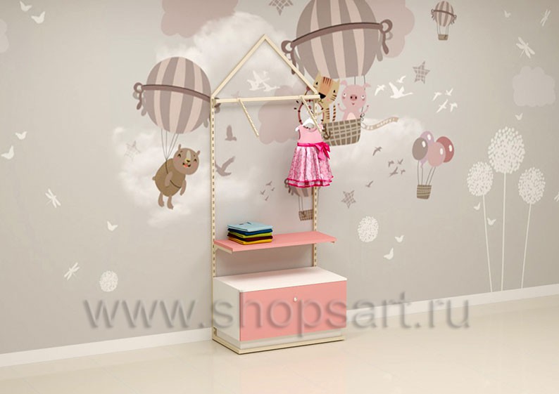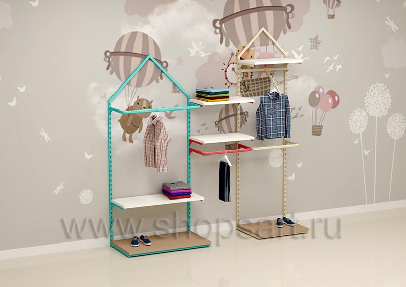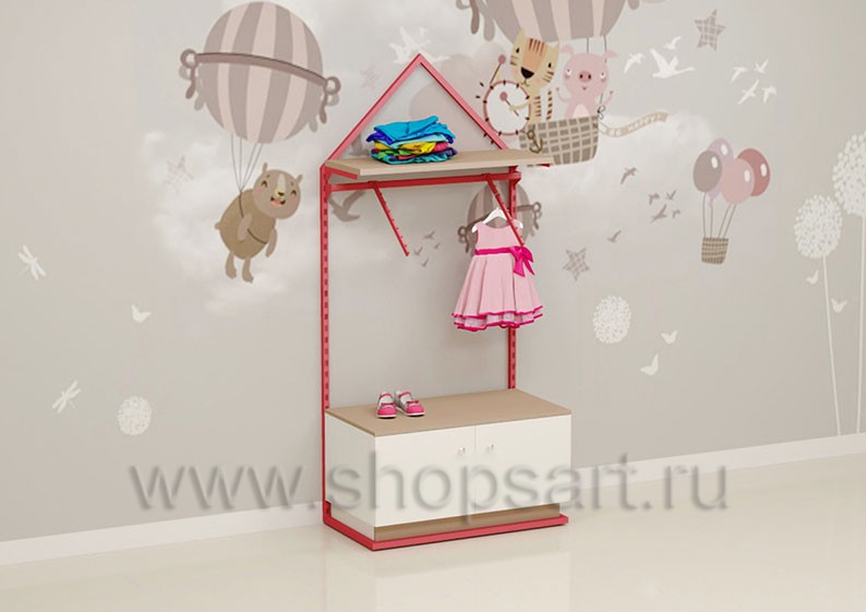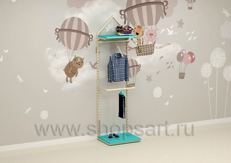 Торговый стеллаж предназначен для демонстрации детской одежды, имеет навеску из «П» образного кронштейна и верхней полочки для выкладки одежды из трикотажа или головных уборов. В нижней части стеллажа устанавливается полочка, на которой можно представить обувь или сумки. Конструкция торгового стеллажа оформлена в виде домика, выполнена из металлической, квадратной трубы с перфорацией.