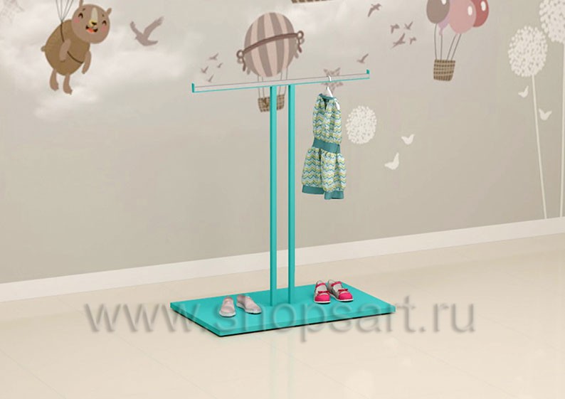 Вешало островное, для демонстрации одежды, Т-образное предназначено для создания островных торговых композиций в магазине детской одежды. Конструкция торгового вешала, благодаря своей форме, позволяет представить большое количество товара, создана для удобного доступа покупателя к товарам. В месте соприкосновения вешала и плечиков монтируется защитная накладка из нержавеющей стали для предохранения окраски вешала от повреждений при эксплуатации. Цвет вешала может быть любым другим.