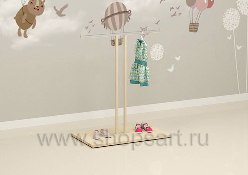 Вешало островное, двустороннее предназначено для демонстрации нарядных платьев или новых коллекций одежды для детей. Устанавливается в центре торгового зала магазина. Изготавливается из квадратной сварной металлической трубы 25х25мм., с покрытием порошковой краской, цвет «Светлая слоновая кость», RAL 1015. В нижней части торгового вешала расположен подиум, на котором можно представить обувь или сумки. В месте навески товара устанавливается защитная накладка из нержавеющей стали для защиты поверхности.