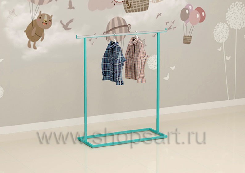 Вешало торговое имеет одноуровневую конструкцию, предназначено для демонстрации одежды в торговом зале магазина или использоваться при оформлении выставочного павильона. Каркас изделия имеет сварное прямоугольное, металлическое основание из квадратной трубы 25х25мм., с покрытием порошковой краской бирюзового, матового цвета. В месте навески товара устанавливается защитная накладка из нержавеющей стали для предохранения металла от повреждений. Может быть окрашено в любой цвет по согласованию с заказчиком.