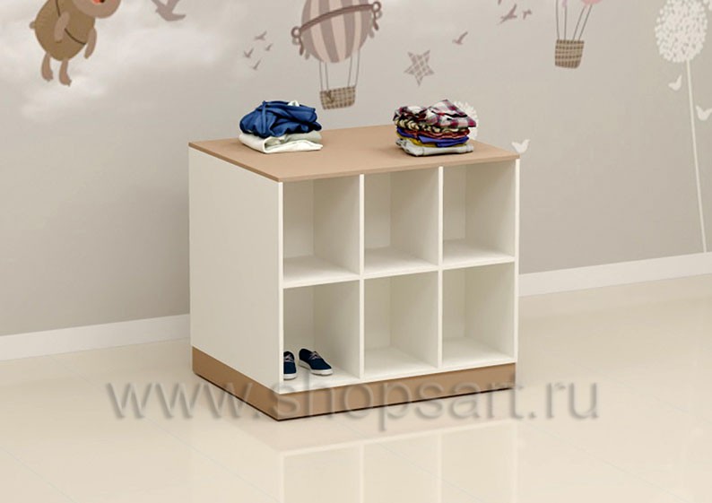 Торговый комод имеет открытую конструкцию в виде ячеек с полочками для выкладки товара, предназначен для оформления пристенных и островных конструкций в торговом зале магазина для детей. Торговый комод можно использовать для выкладки одежды, пижам, сумок для мам или косметики. Каркас изделия выполнен из белого, матового ЛДСП 16 мм. Столешница и цоколь выполнены из матового ЛДСП 16 мм цвет «Мокко».
