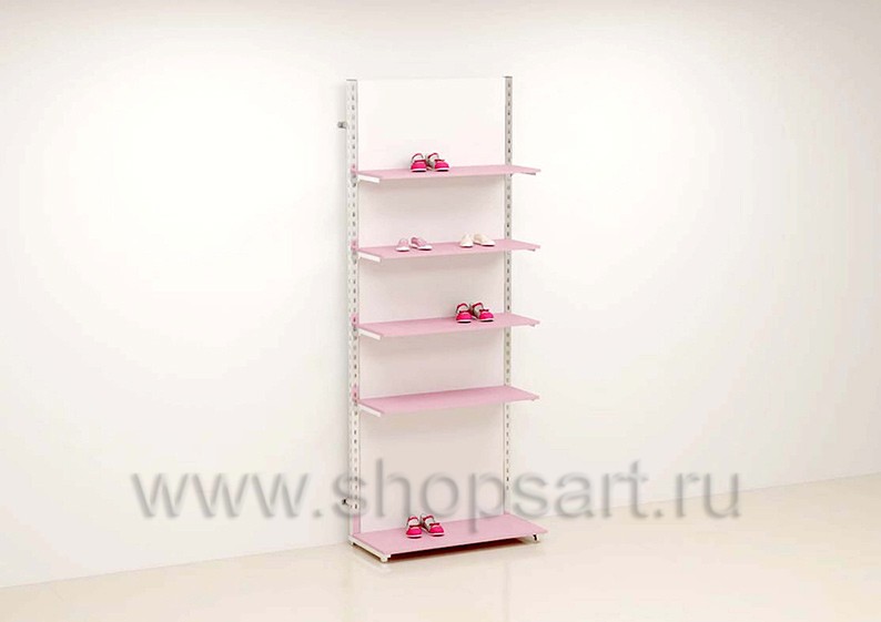 Пристенный стеллаж предназначен для демонстрации обуви, имеет открытую конструкцию с полочками. Конструкция торгового стеллажа состоит из перфорированных стоек, которые устанавливаются в нижние опоры и не требуют крепления к стене. Задняя панель стеллажа и полочки для выкладки товара выполнены из матового ЛДСП 16 мм белого и розового цвета. Перфорированные стойки, нижние опоры и навесные кронштейны в данном стеллаже выполнены с покрытием порошковой краской белого, матового цвета.