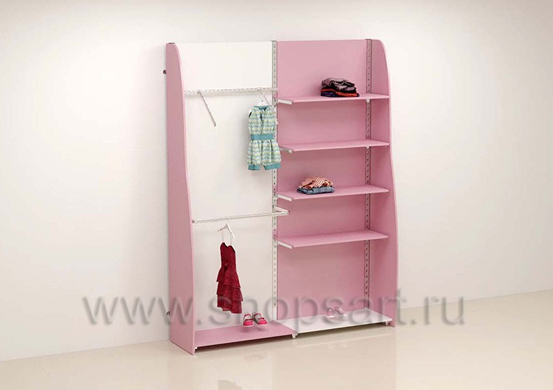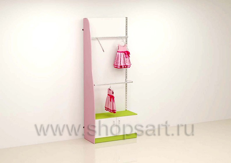 Торговый стеллаж предназначен для демонстрации одежды, укомплектован навесными кронштейнами. В нижней части стеллажа устанавливается накопитель с распашными дверками для хранения и сортировки товара, выполнен из комбинированного, матового ЛДСП 16 мм. На боковой части стеллажа установлена декоративная, фигурная панель из ЛДСП 16 мм розового, матового цвета. Перфорированные стойки и навесные кронштейны выполнены с покрытием порошковой краской белого, матового цвета.