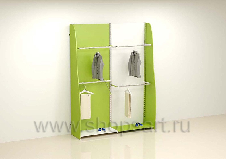 Торговый стеллаж предназначен для демонстрации одежды, оснащен навесным фронтальным и «П» образным кронштейном. В нижней части стеллажа устанавливается подиум для демонстрации обуви или сумок. Торгово-модульная система состоит из перфорированных стоек, нижних опор и не требует крепления к стене. Навесные элементы устанавливаются в перфорированную стойку и регулируются по высоте. Задняя панель изделия и подиум выполнены из матового ЛДСП 16 мм, цвет «Зелёный лайм». Стойки и кронштейны выполнены с покрытием порошковой краской белого, матового цвета.
