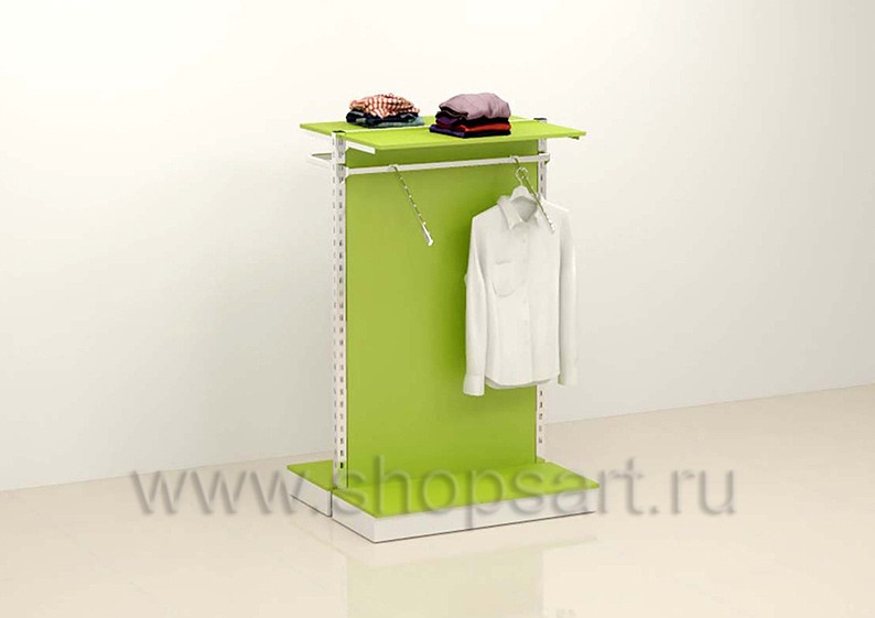 Островная двухсторонняя стойка, предназначена для демонстрации одежды, оснащена навесными «П» образными и фронтальными кронштейнами, и полочками для изделий из трикотажа. В нижней части конструкции торговой стойки установлены демонстрационные подиумы, на которых можно представить обувь Островная торговая стойка выполнена из матового ЛДСП 16 мм белого цвета и цвета «Зелёный лайм». Все навесные кронштейны устанавливаются в перфорированную стойку, взаимозаменяемы и регулируются по высоте.