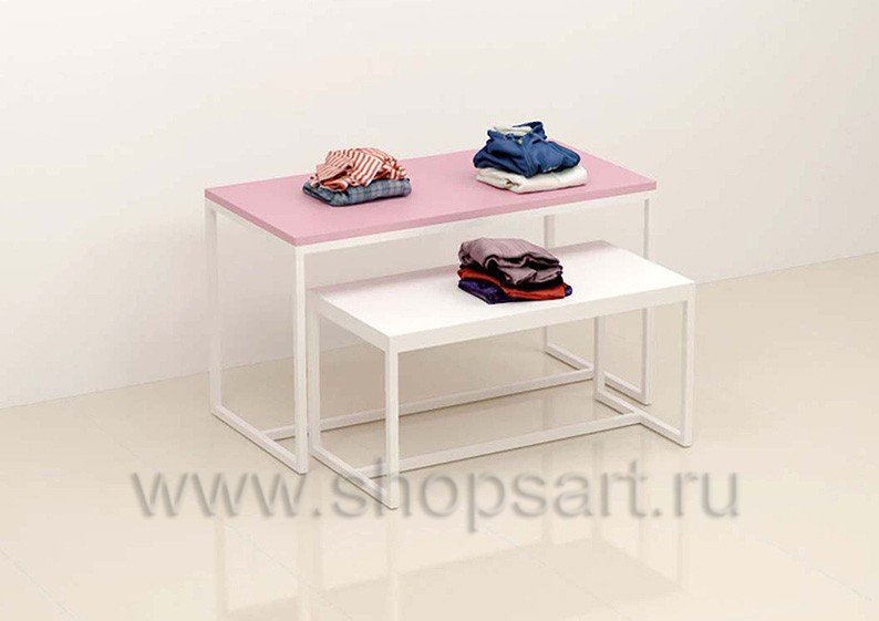 Комплект демонстрационных столов состоит из большого и малого столика. Островные столики, предназначены для выкладки товара, устанавливаются в центре торгового зала или используются для оформления витрин магазина. Каркас столиков металлический, изготавливается из трубы 25×25 мм с покрытием порошковой краской белого, матового цвета. Столешницы столов изготовлены из матового ЛДСП 16 мм белого и розового цвета.