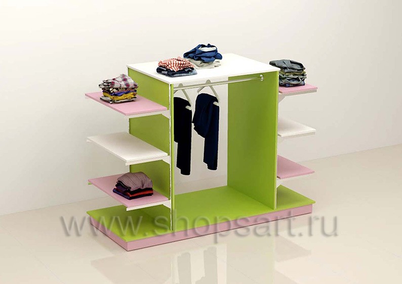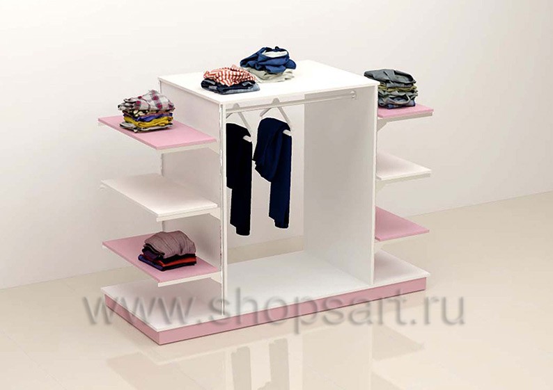 Торговый остров предназначен для демонстрации одежды в торговом зале детского магазина. Центральная часть острова состоит из открытой секции со штангой для демонстрации одежды на плечиках. Боковые стенки торгового острова стойки состоят из полочек, служат для выкладки одежды из трикотажа или обуви. Изделие выполнено из комбинированного матового ЛДСП 16 мм белого и розового цветов.
