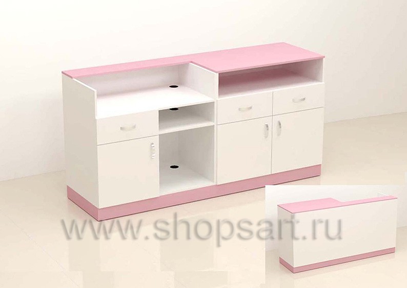 Кассовый стол с декоративной накладкой состоит из рабочего места продавца или кассира. Изделие выполнено с боковым, открытым торговым прилавком для сопутствующих товаров. Внутренне наполнение кассового стола состоит из открытой секции с полочками, укомплектовано ящиком, оснащенным выкатным механизмом полного выдвижения и тумбой с распашной дверкой для хранения товара или личных вещей. Изделие выполнено из белого и розового, матового ЛДСП 16 мм.