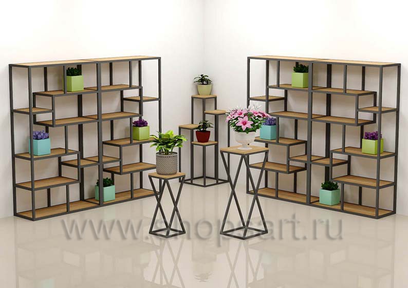 Оборудование для цветочного магазина в виде блока торговых, пристенных стеллажей имеет открытую конструкцию для выкладки товара, предназначен для демонстрации растений в горшках, ваз для букетов или книг по уходу или выращиванию растений. Каркас изделия имеет в своей основе цельносварную металлическую конструкций из квадратной трубы 25×25 мм с покрытием порошковой краской чёрного, матового цвета. Кубы, полочки и ящики для выкладки товара изготовлены из матового ЛДСП 16 мм.