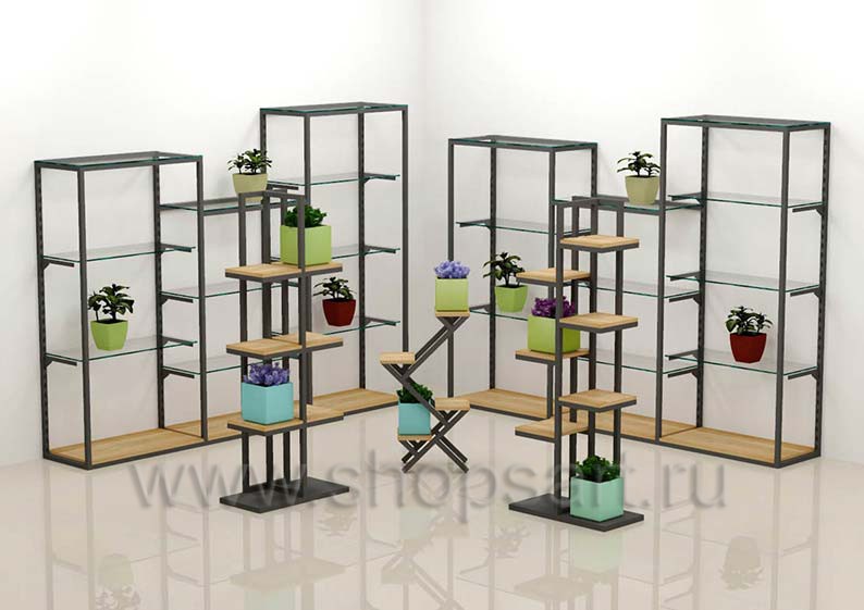 Корнер цветочного магазина состоит из стеллажей со стеклянными полочками, позволяет красиво и презентабельно представить растения в горшках или композиции букетов из живых цветов. Каркас изделия имеет в своей основе цельносварную металлическую конструкцию из квадратной трубы 25×25 мм с покрытием порошковой краской чёрного, матового цвета. Для выкладки товара устанавливаются полочки, выполненные из бесцветного стекла 8 мм и ЛДСП 16 мм.