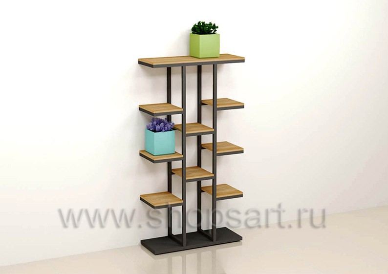 Стойка напольная для цветов предназначена для оформления торговых витрин магазина, пристенных торговых конструкций или для создания островных композиций в центре торгового зала. Каркас изготавливается из цельносварной металлической, квадратной трубы 25X25 мм с покрытием порошковой краской чёрного, матового цвета. Полочки для демонстрации товара выполнены из матового ЛДСП 16 мм. По желанию заказчика торговая стойка может быть выполнена в любом, другом цвете материалов и габаритных размерах.