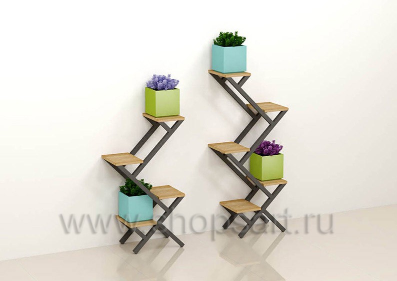Комплект торговых стоек предназначен для демонстрации растений. Необычная, зигзагообразная форма стоек, непременно привлечет к себе заинтересованные взгляды покупателей, поможет презентабельно представить растения или вазы. Каркас изготавливается из цельносварной металлической, квадратной трубы 25х25 мм с покрытием порошковой краской чёрного, матового цвета. Полочки для выкладки товара выполнены из матового ЛДСП 16 мм цвет «Дуб Сакраменто светлый».