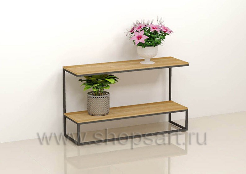 Подставка для цветочного магазина предназначена для демонстрации горшечных растений, небольших букетов из свежих цветов, подойдет для оформления пристенных торговых конструкций в магазине или салоне цветов. Каркас изделия выполнен из цельносварной металлической трубы 25×25 мм с покрытием порошковой краской чёрного, матового цвета. Полочки для выкладки товара выполнены из матового ЛДСП 16 мм.