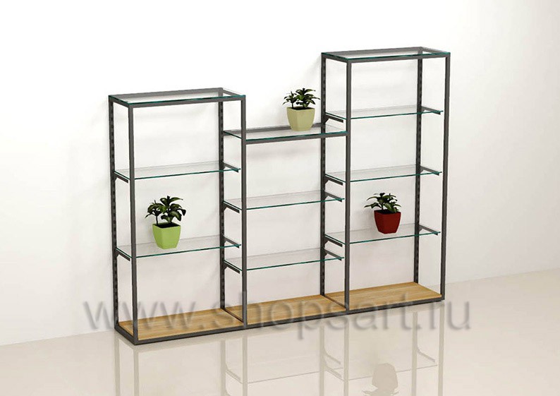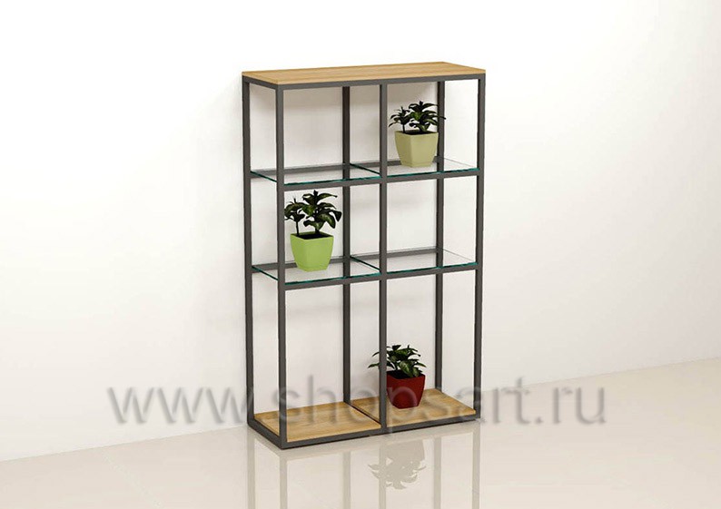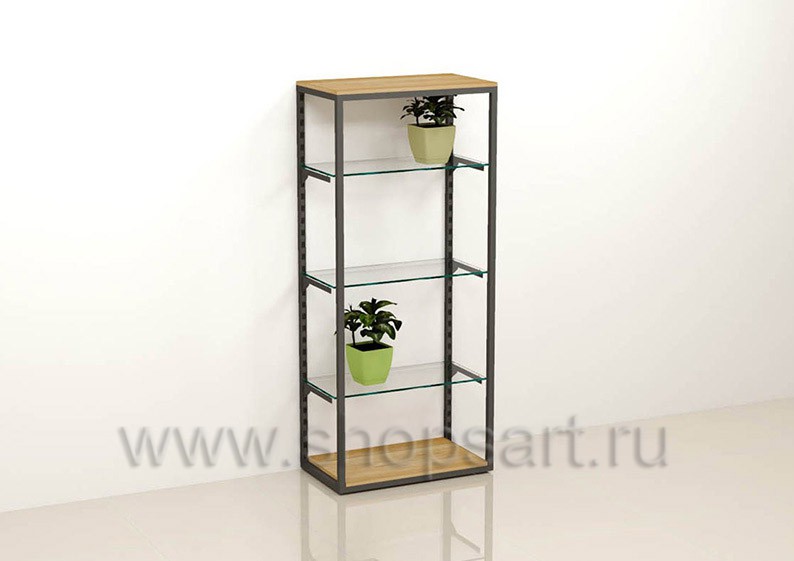 Стеллаж со стеклянными полками предназначен для демонстрации растений в горшках, подойдет для оформления пристенных торговых конструкций в магазине или для оформления торговой витрины. Каркас изделия выполнен из металлической квадратной трубы 25×25 мм с покрытием порошковой краской чёрного, матового цвета. Полки для выкладки товара выполнены из бесцветного стекла 8 мм. В нижней и верхней части пристенного стеллажа установлены полки из матового ЛДСП 16 мм.