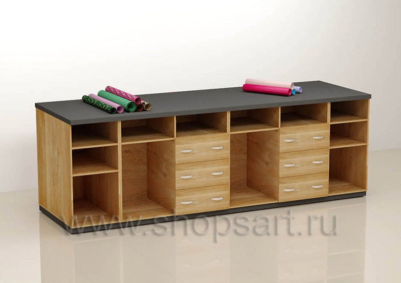 Стол для магазина цветов предназначен для оформления торгового павильона или магазина цветов большой площади. Рабочая столешница для создания цветочных композиций выполнена из влагостойкой плиты темно-серого, матового цвета. Каркас изделия выполнен из матового ЛДСП 16 мм цвет «Дуб Сакраменто светлый». Внутреннее наполнение стола состоит из открытых секций с полками и ящиками, что дает возможность разместить все необходимые для работы принадлежности.