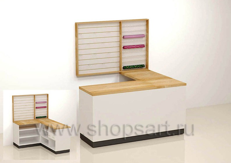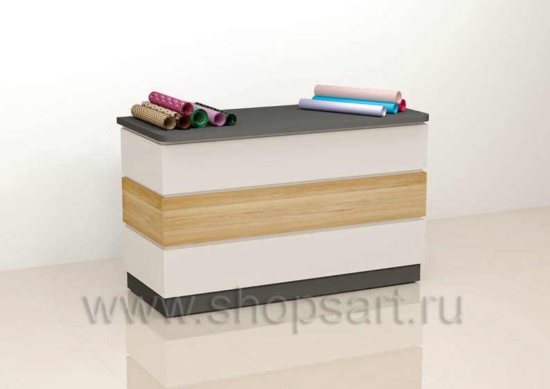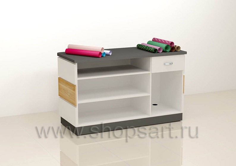 Стол кассира состоит из рабочего места продавца или флориста. Внутренне наполнение кассового стола укомплектовано ящиком, оснащенным выкатным механизмом полного выдвижения и открытыми полочками для хранения расходного материала и необходимых инструментов для работы. Изделие выполнено из матового ЛДСП 16 мм, цвет «Дуб Сакраменто светлый».