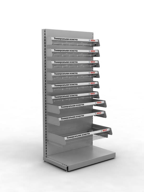 Торговый металлический стеллаж для магазинов служит для продажи продукции фирмы “BOSCH”. Устанавливается возле стены как отдельно стоящий, так и в линии подобных стеллажей. Брендовый стеллаж комплектуется задней перфорированной панелью с крючками и полками. Вверху фирменного стеллажа монтируется световой короб со светодиодными светильниками для освещения товара. Логотип компании на световом коробе имеет свою подсветку.