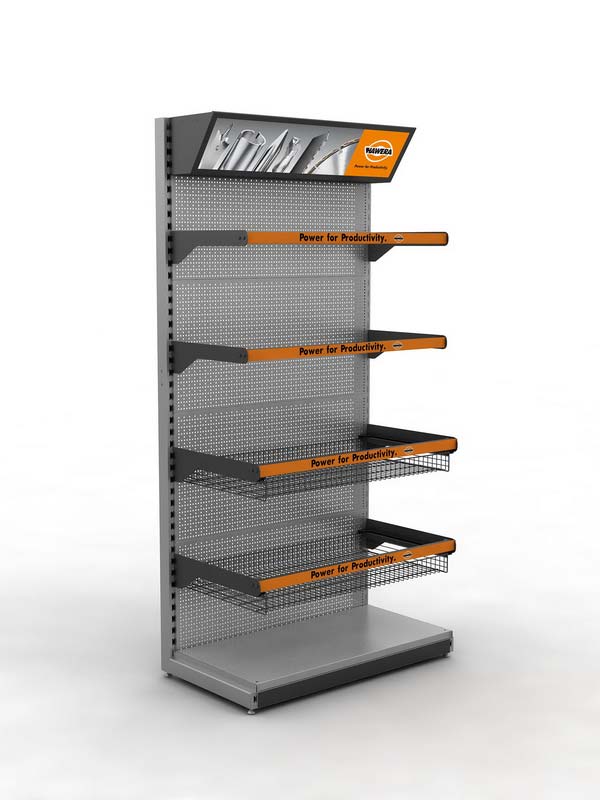 Торговый металлический стеллаж для продажи электроинструментов устанавливается возле стены в строительных магазинах. Брендовый стеллаж комплектуется задними перфорированными панелями, навеской, состоящей из крючков – держателей электроинструмента и полочками – держателями кабеля. Вверху фирменного стеллажа монтируется световой короб со светодиодными светильниками для освещения товара. Фирменный логотип вырезан в металле короба и имеет свою подсветку.