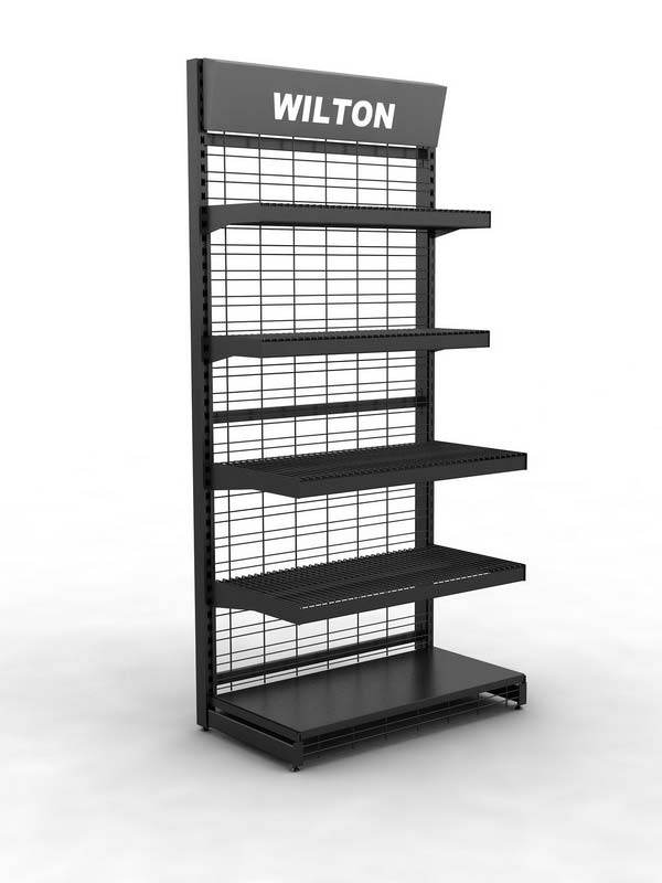 Сетчатый торговый металлический стеллаж служит для выкладки и продажи бытового и профессионального инструмента фирмы “Wilton”. Стеллаж, имеет в основе перфорированные стойки, сетчатые полки с возможностью перемещения на разную высоту, сетчатую заднюю стенку с возможностью вывешивания на нее товара на крючках. На стеллаже этой конструкции возможно выложить продукцию большого веса. Верхний, наклонный, фриз сетчатого стеллажа содержит название бренда.