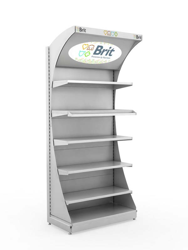 Торговый металлический стеллаж служит для выкладки и продажи корма для кошек и собак производителя питания для домашних питомцев “Brit”. Стеллаж оснащается полками, подиумом, лайтбоксом и радиусными декоративными боковинами, идущими снизу-вверх и плавно переходящими в конструкцию светового короба. Полки могут передвигаться по высоте на любой уровень. Лайтбокс оснащен светодиодной подсветкой для освещения рекламного бренда компании и верхних полок. На верхний козырек торгового стеллажа наносится логотип и название компании.