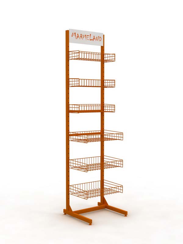 Торговая металлическая стойка служит для продажи мармелада и других сладостей. Облегченная стойка комплектуется сетчатыми корзинами разного размера. Корзины навешиваются на перфорированные стойки и могут регулироваться по высоте. Вверху устанавливается панель из пластика с фирменным логотипом компании. Стойка окрашивается в корпоративный цвет компании.