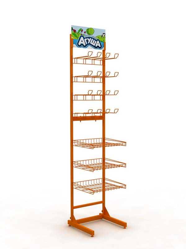 Торговый металлический стеллаж служит для выкладки и продажи соков торговой марки “Добрый”. Стеллаж комплектуется сетчатыми корзинами и полками с боковыми ограничителями. Вверху стеллажа монтируется козырек с брендом компании. По желанию заказчика возможна установка светового короба. Брендовый стеллаж окрашен в фирменный цвет торговой марки компании.