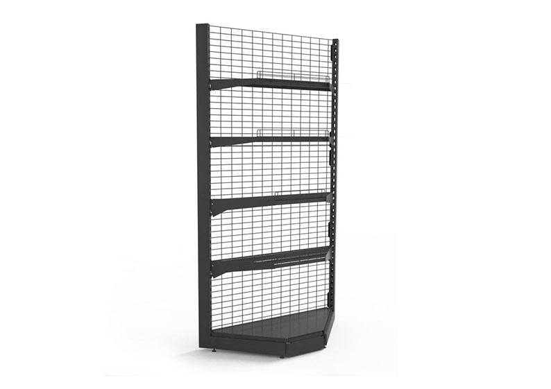 Внутренний угловой сетчатый стеллаж с полками используется для выкладки товара, на заднюю стенку можно делать навеску на крючки. Полки могут комплектоваться проволочными ограждениями. Данный пристенный стеллаж универсален, подойдет для любой торговой точки. По желанию заказчика торговый стеллаж окрашивается в любой цвет согласно палитре цветов RAL.