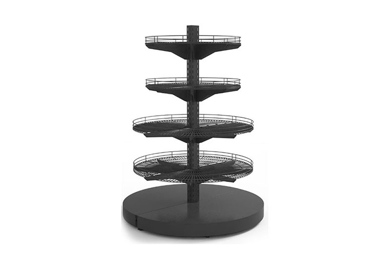 Торговая стойка имеет круглую конструкцию, удобна для выкладки товара и его просмотра покупателями. Оптимальная прочность конструкции напольной торговой стойки делает её самым практичным решением для магазинов самообслуживания с большой проходимостью. Полки комплектуются проволочными ограничителями. Стойка рассчитана на долгий срок эксплуатации. По желанию заказчика торговая стойка для магазина окрашивается в любой цвет согласно палитре цветов RAL. Стойка может быть изготовлена в любом другом размере.