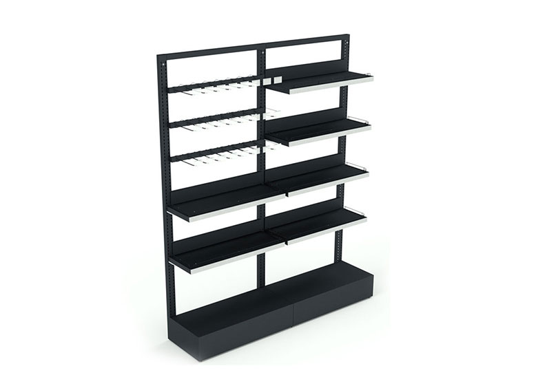 Торговый стеллаж для демонстрации товара имеет открытую конструкцию, внизу установлен подиум. Пристенный стеллаж оснащен навесными крючками для вывешаемого товара и полками для демонстрации и выкладки продукции. На полках устанавливаются ограничители и ценникодержатели. Полки регулируются по высоте.