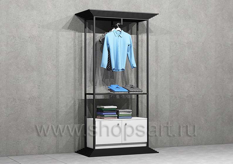 Стеллаж для продажи одежды в стиле ЛОФТ в основе которого металлический каркас с покрытием порошковой краской чёрного, матового цвета. Для демонстрации одежды торговый стеллаж оснащен фронтальным кронштейном и полочкой для выкладки товара. В нижней части стеллажа устанавливается накопитель с распашными дверками из белого, матового ЛДСП для сортировки и хранении товара. Стеллаж декорирован карнизом и подиумом, оформленным в классическом стиле.