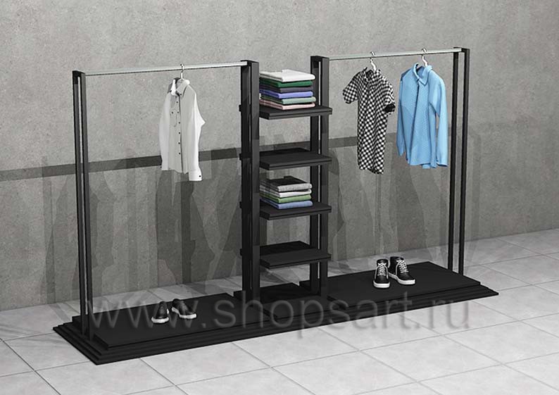 Стойка островная, в стиле ЛОФТ, используется для демонстрации мужской одежды и состоит из секции со штангой для навески одежды, и секции с полочками для выкладки товара. Каркас островной стойки изготавливается из сварной квадратной трубы 25х25 мм. с покрытием порошковой краской чёрного, матового цвета. Полочки изготавливаются из черного, матового ЛДСП 16 мм. В нижней части стойки устанавливается декоративный, классический подиум для демонстрации обуви или аксессуаров.